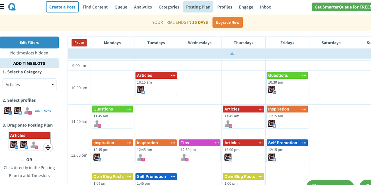 Much like SmarterQueue, you can also arrange your posts—those you write or automate—by Categories, to ensure you mix up your content. However, this is not included in the Basic plan. Another great feature with the Pro plan is the Everqueue, which works the same as SmarterQueue’s Evergreen feature.