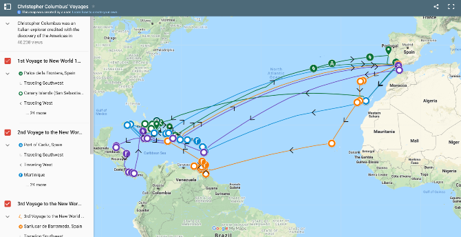 In total, Columbus made four voyages from Spain to America, landing in the Caribbean, Cuba, Dominican Republic, and Haiti. This user-made map overlay on top of Google Maps charts every voyage’s important points, with a short description for each.