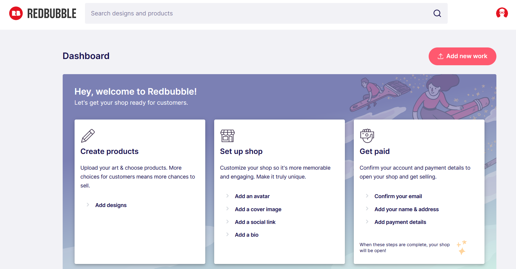 To design t-shirts here, first, you need to create an account by clicking the Sell your art button on the homepage. From your dashboard, you can then upload artwork and see what it looks like on different products.