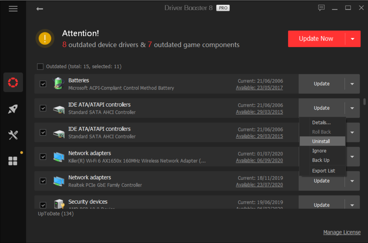 The individual Update buttons reveal further options and information. Details about the driver can be found, you can Roll Back the driver, or even Uninstall it. There is the option to Ignore update requests, Back Up existing drivers, while Export List lets you keep a record of what needs updating.